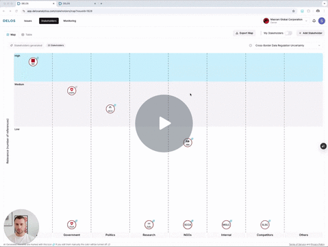 The Stakeholders section gives you a structured view of the people, organizations, and institutions that influence or are affected by your key issues. It helps you identify, prioritize, and monitor the actors who matter most to your organization’s strategic landscape.